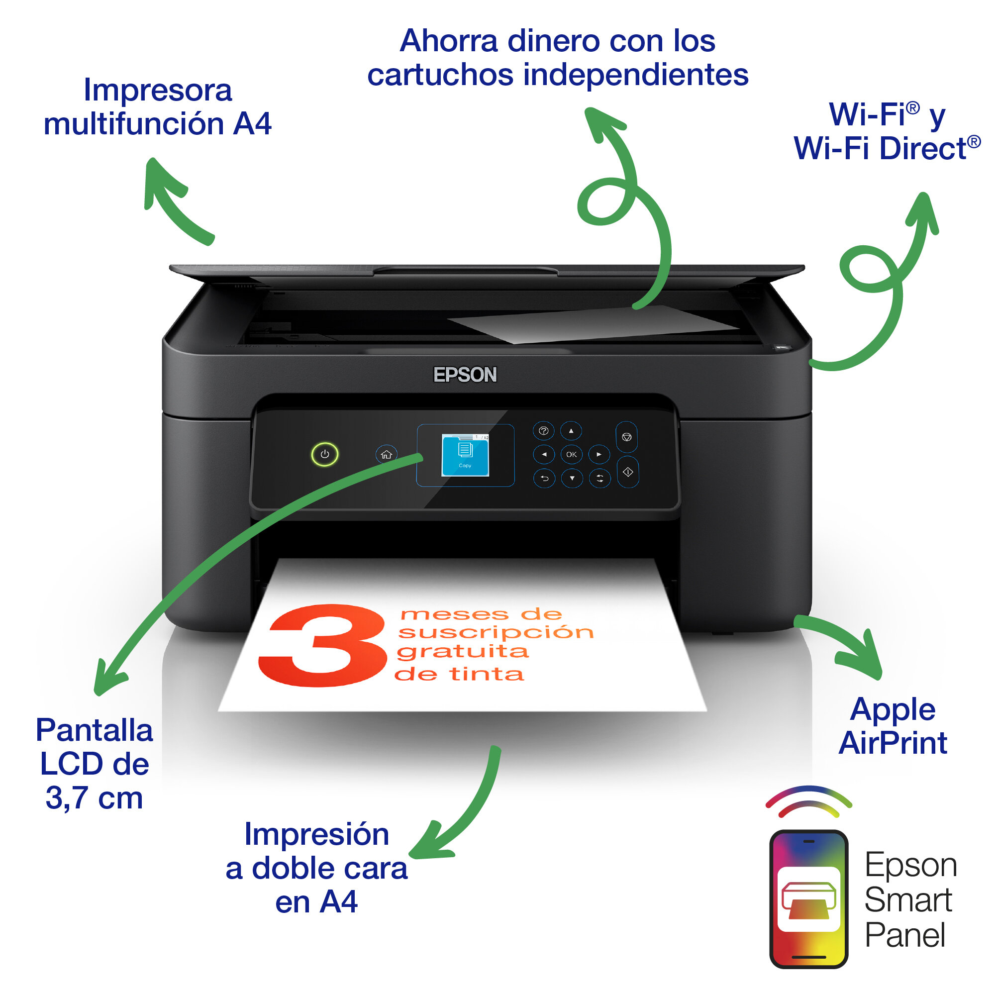 Al contar con una amplia variedad de funciones esenciales de fácil uso, con la XP-3205 podrás imprimir y escanear de forma inalámbrica desde cualquier lugar, y con Wi-Fi Direct podrás imprimir sin necesidad de conectarte a una red inalámbrica. Su pantalla LCD de 3,7 cm permite copiar e imprimir fácilmente sin necesidad de PC y con la impresión a doble cara reducirás el gasto de papel.